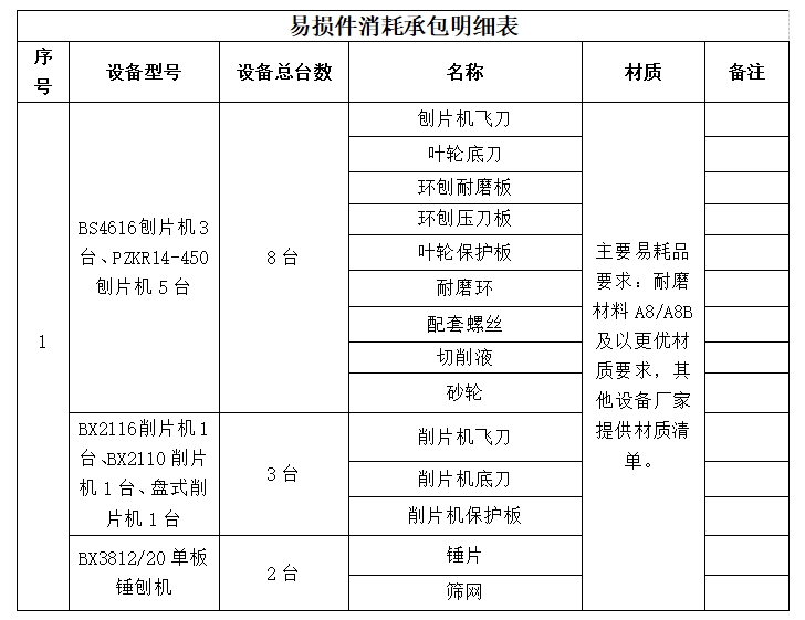 1、 工程(项目)内容概述:乙方为甲方提供刨花制造设备的所有易损件,以年产量计算单耗计价,按压机有效产量进行结算