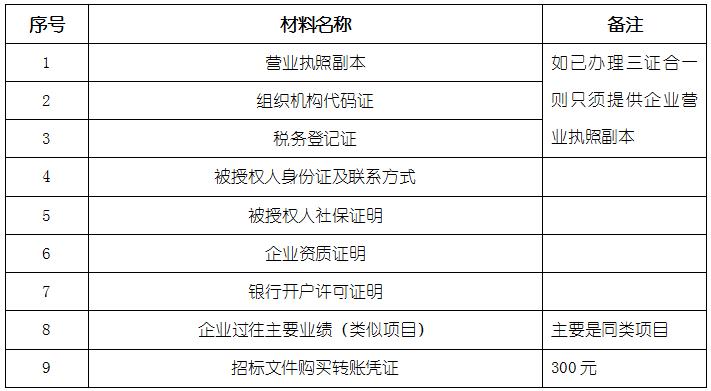 2、 凡有意向参加投标者,请在上述期间内按下表提供报名资料,相关证明文件的原件如无法提供原件则提供复印件加盖公司公章,投标人须将上述资料的扫描件发邮件至招标联系人处进行报名。