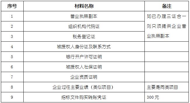 2、 凡有意向参加投标者,请在上述期间内按下表提供报名资料,相关证明文件的原件如无法提供原件则提供复印件加盖公司公章,投标人须将上述资料的扫描件发邮件至招标联系人处进行报名。