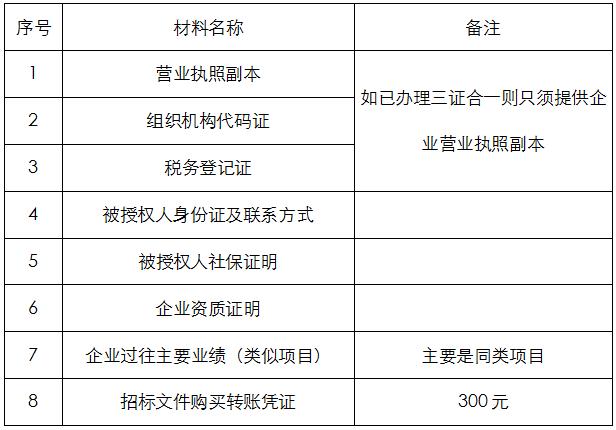 2、凡有意向参加投标者,请在上述期间内按下表提供报名资料,相关证明文件的原件如无法提供原件则提供复印件加盖公司公章,投标人须将上述资料的扫描件发邮件至招标联系人处进行报名。