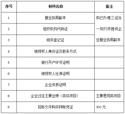 2、 凡有意向参加投标者,请在上述期间内按下表提供报名资料,相关证明文件的原件如无法提供原件则提供复印件加盖公司公章,投标人须将上述资料的扫描件发邮件至招标联系人处进行报名。