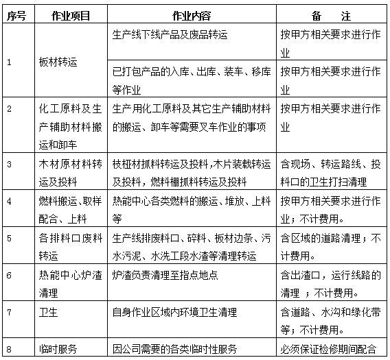 满足我方24小时不间断作业,将我生产所需的木片、燃料、水渣、废料、灰渣等按要求转运到我方指定区域。在我方生产设备检修期间必须按我方需要协助检修工作。