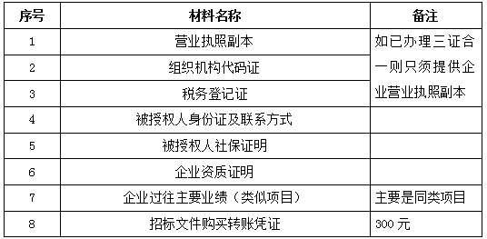 2、 凡有意向参加投标者,请在上述期间内按下表提供报名资料,相关证明文件的原件如无法提供原件则提供复印件加盖公司公章,投标人须将上述资料的扫描件发邮件至招标联系人处进行报名。
