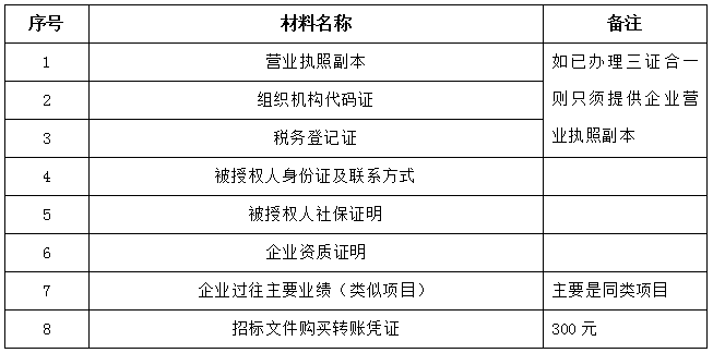2、 凡有意向参加投标者,请在上述期间内按下表提供报名资料,相关证明文件的原件如无法提供原件则提供复印件加盖公司公章,投标人须将上述资料的扫描件发邮件至招标联系人处进行报名。