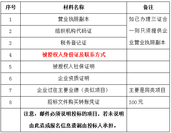 2、 凡有意向参加投标者,请在上述期间内按下表提供报名资料,相关证明文件的原件如无法提供原件则提供复印件加盖公司公章,投标人须将上述资料的扫描件发邮件至招标联系人处进行报名。