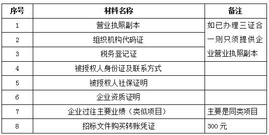 2、 凡有意向参加投标者,请在上述期间内按下表提供报名资料,相关证明文件的原件如无法提供原件则提供复印件加盖公司公章,投标人须将上述资料的扫描件发邮件至招标联系人处进行报名。