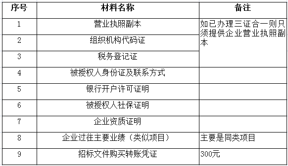 3、 凡有意向参加投标者,请在上述期间内按下表提供报名资料,相关证明文件的原件如无法提供原件则提供复印件加盖公司公章,投标人须将上述资料的扫描件发邮件至招标联系人处进行报名。
