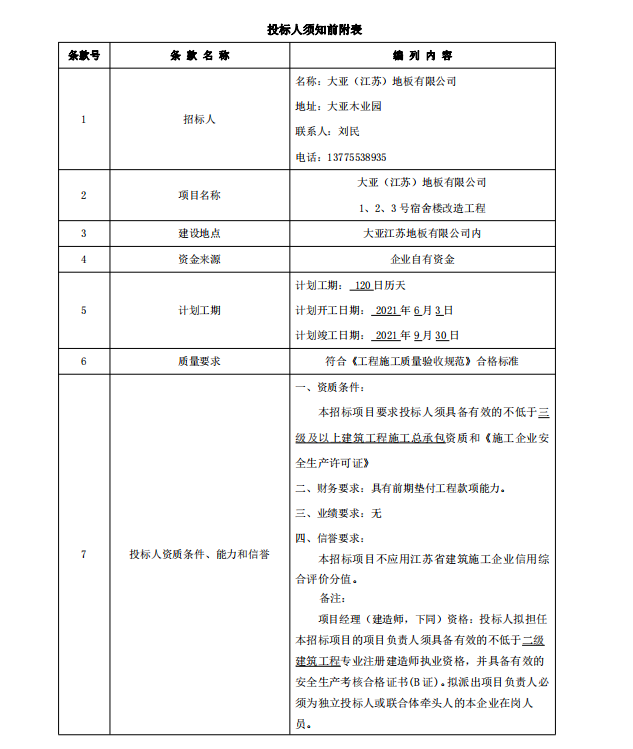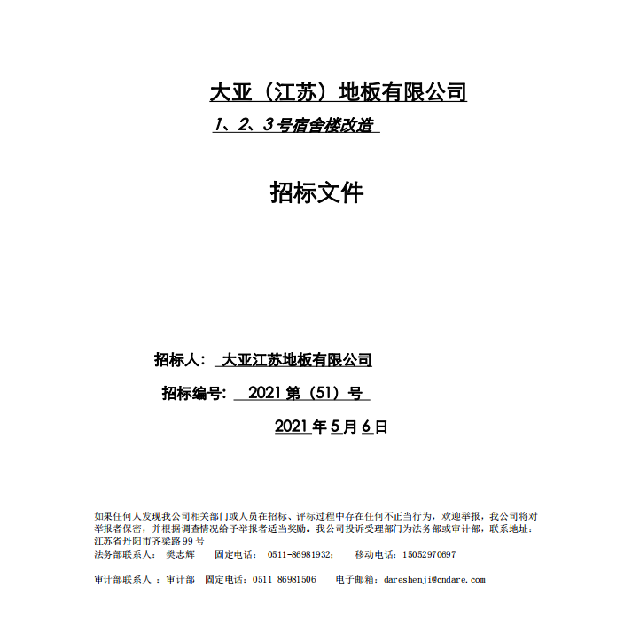 大亚(江苏)地板有限公司1、2、3号宿舍楼改造招标文件