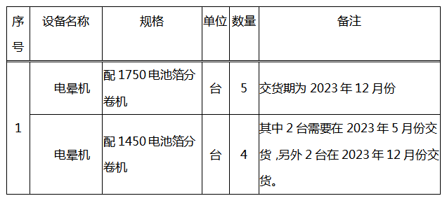 1、本次招标为9台电池箔电晕机,主机功率:总功率45-60KW,可调节,用于电池箔、常规铝箔电晕处理。来料达因值为28~31(达因笔),执行标准GB/T22638.4。要求机列运行线速度为150m/min时处理后整卷稳定提升4个达因值以上,机列运行线速度为200m/min以上时处理后提升2个达因值。
