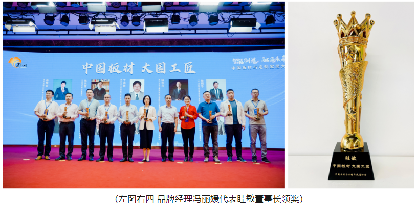 会上,大亚人造板集团董事长眭敏荣膺“中国板材 大国工匠”,李佳峰会长和刘文杰秘书长先后为获得“中国板材 大国工匠”的企业家及其代表颁发了荣誉奖杯。