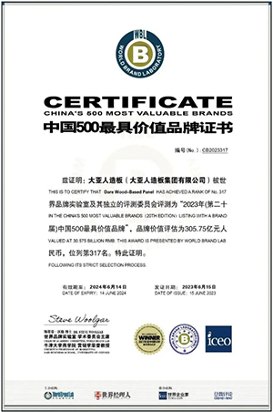2023年,大亚人造板以305.75亿元品牌价值蝉联中国人造板行业榜首,价值增幅33.6%!品牌排名317位,第六次荣登最具价值品牌(人造板行业)榜首!