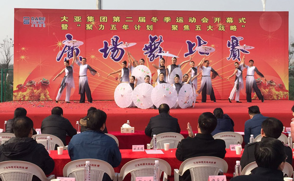 集团副总裁眭敏宣布大亚集团第二届冬季运动会开幕!集团董事局办公室主任、工会主席张建松在开幕式上致辞。他指出,集团举办本届运动会的目的是深入贯彻落实陈晓龙董事长提出的“以竞技彰显活力,以文化凝聚力量,在运动中创新思路,在竞争中提升技能”的融合发展理念,进一步唱响企业发展主旋律,传播奋进正能量,舞动青春新风采。本届运动会共有来自集团公司10个代表队900多名运动员共参加16个项目的比赛。他希望全体运动员、裁判员要坚持“友谊第一、比赛第二、公平竞争”的原则,遵守赛场纪律,遵守比赛规则,顽强拼搏、勇于争先、赛出风格、赛出水平,以优异的成绩展示企业员工的精神面貌和绚丽风采。努力把本届运动会一定能办成“内聚力量、外塑形象”,全面冲刺企业年度计划目标实施的体育盛会和竞技展示会,并通过此次活动,将“追求卓越、挑战极限、创新发展、敢于担当”企业精神,伴随着大亚五年计划和五大战略的实施不断得到新的升华。