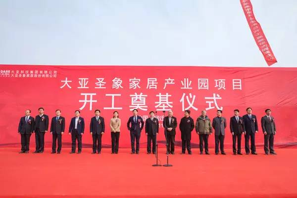奠基仪式由宿迁市宿城区区委副书记、区长张辉主持,石峰代表中国林产工业协会对大亚科技集团表示热烈的祝贺!过利平代表市委市政府向大亚圣象家居产业园项目的开工奠基表示热烈的祝贺并衷心预祝大项目早日竣工投产。大亚圣象产业园项目启动建设,是宿迁市产业发展上的一件大事,对扩大宿迁经济总量、促进群众就业发挥重要作用。大亚科技集团董事长陈晓龙表示,在宿迁市市长王天琦及各级政府部门的支持下,努力把该项目建设成全球人造板行业精品工程,为推动宿迁市产业升级转型和经济发展做出积极贡献!