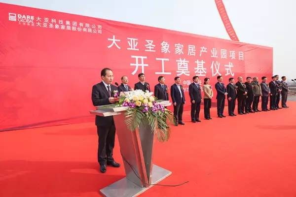 2017年1月11日上午,落户于宿迁市宿城区运河宿迁港产业园的大亚圣象家居产业园苏北基地年产50万立方米刨花板项目开工奠基仪式隆重举行。宿迁市市委常委组织部部长过利平,宿迁市人民政府副市长赵丽丽,大亚科技集团有限公司董事局主席兼总裁、大亚圣象家居股份有限公司董事长陈晓龙,区直各部门代表,特邀嘉宾及大亚圣象公司代表共200人参加本次的开工奠基仪式。