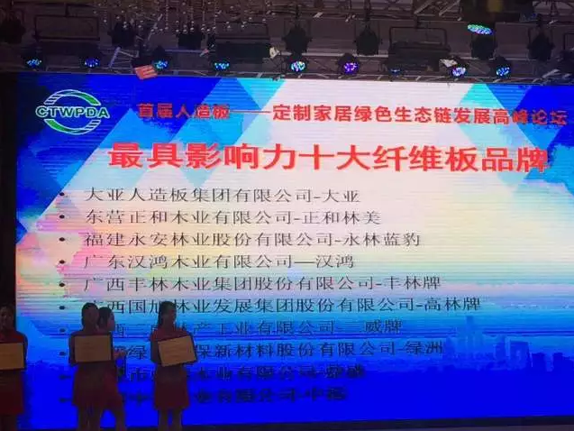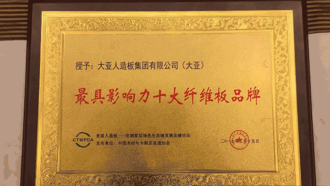 会上,中国木材与木制品流通协会隆重揭晓最具影响力十大纤维板品牌等奖项, 大亚人造板集团有限公司(大亚牌)以优秀的产品品质、卓越的市场影响力荣膺十大纤维板品牌之首。该奖项是对十几年如一日专注于环保板材生产与流通的大亚人造板的充分肯定与鼓励。