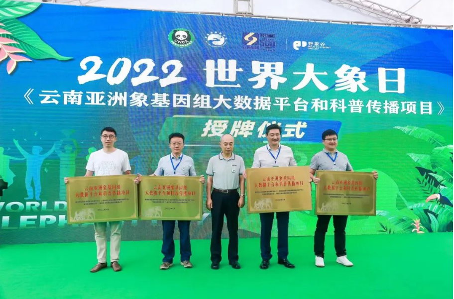 在世界大象日当天的开幕式上,一个亮眼的环节就是”云南亚洲象基因组大数据平台和科普传播”项目作为亚洲象科研和保护项目被正式确立,国家林业和草原局动植物保护司张志忠司长向项目科研承担单位授牌,这标志着该项目的正式启动。