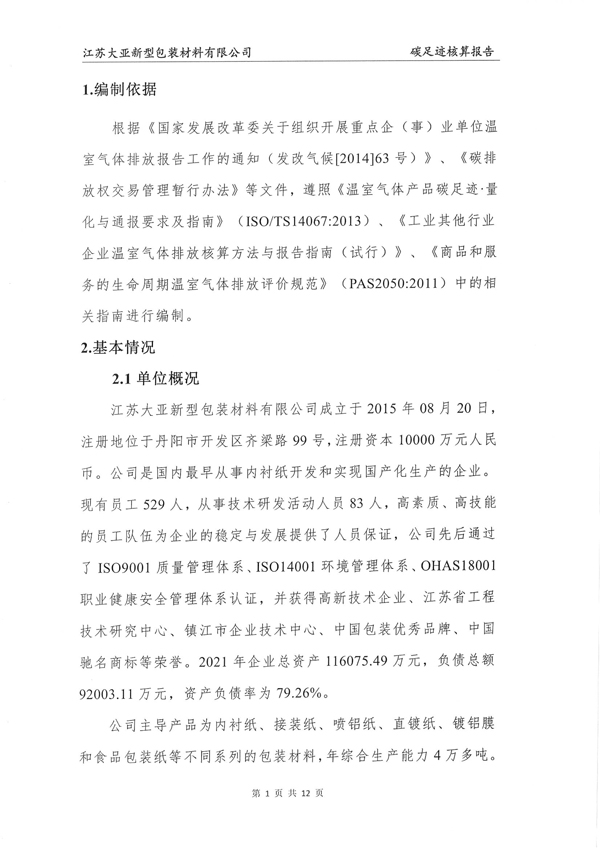 《江苏大亚新型包装材料有限公司2021年碳足迹核算报告》根据《国家发展改革委关于组织开展重点企(事)业单位温室气体排放报告工作的通知(发改气候[2014]63号)》、《碳排放权交易管理暂行办法》等文件,遵照《温室气体产品碳足迹·量化与通报要求及指南》(ISO/TS14067:2013)、《工业其他行业企业温室气体排放核算方法与报告指南(试行)》、《商品和服务的生命周期温室气体排放评价规范》(PAS2050:2011)中的相关指南进行编制。